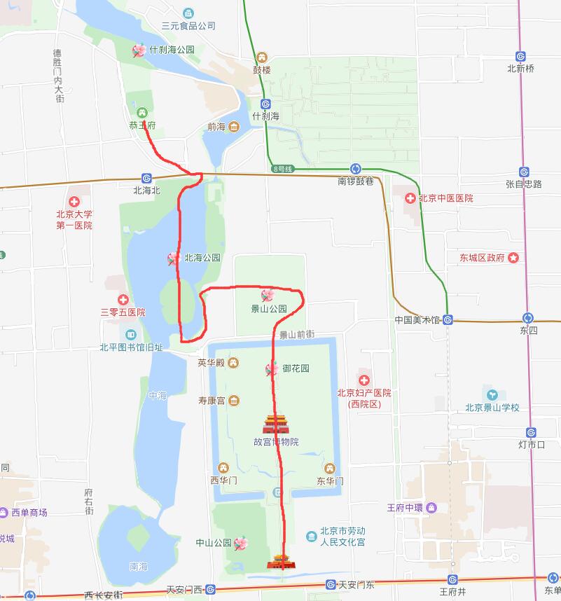D1,这天安排比较满,步行路程比较长,有点儿考验体力。一早到天安门广场,向北穿天安门、端门,从午门进故宫,游览故宫,从北门——神武门出故宫;然后进景山南门,右转看看崇祯上吊的歪脖树,登景山俯瞰故宫,西侧下山出景山西门;进北海东门,沿湖边左转到南门,可出南门逛团城(跟门口打声招呼,再从南门进来不用二次购票),然后登琼岛,北边下山,坐渡船直接到北海北岸,参观五龙亭、铁影壁和九龙壁,出北海北门,西北方向去恭王府,然后在后海解决晚餐。注意事项:1.提前网购故宫门票。2.没有特别合适的午餐地点,建议备干粮或者随便找个地方快餐解决。