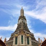 郑王庙(Wat Arun),又称黎明寺(Temple of the Dawn),位于湄南河畔,坐船游河的时候就能从水上看到。 寺庙中有五座佛塔,最大的佛塔79米高,素有“泰国埃菲尔铁塔”的美称。佛塔上铺贴许多彩色碎陶瓷是郑王庙塔的特色之一。宝塔台阶旁还有很多小雕塑,孔雀,女神,金翅鸟等等,这也是佛塔另一大特色。
