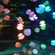 位于正佳入面的海洋馆,趁着假期来参观一下。在正佳西门附近进入,门口有保管箱,方便游客寄存东西,但寄存的柜不是很多,空间有点小。门票相对整体的环境来说偏贵,大人正价需要220元,小朋友和长者130元。门口有张贴表演时间,有兴趣的可以记下留意开场时间。 从正门入内,穿越电子屏幕长隧道,恍惚穿越时空。 海洋馆内分不同的区域,首先是各类型的鱼类,鱼缸有d细,鱼的品种也不算很多,可以喂鱼,喂龟,同它们亲密接触,当然,需要给喂养的饲料费。 最漂亮的是水母区,水母是白色透明的,但通过七彩的灯光照射下幻化出七彩缤纷的水母,拍照很好看。 看了一个白鲸的表演,表演场地没有位置的,需要席地而坐。潜水员与白鲸的互动,大约表演十几分钟。 最可爱的就是企鹅,小小的身躯,走起路来左右摇摆特可爱。 总体来说,海洋动物不是太多,空间太小,大约1小时足以走完。
