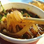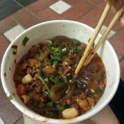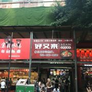 逛完解放碑,向北走右转便是八一路步行街,好吃街大门口就是朋友强烈推荐的好又来酸辣粉,这个把那么能吃辣的重庆朋友吃得嘴唇肿起来的酸辣粉。店前排队长龙,人气极旺。店面没有提供吃饭的桌椅,很多人端起在路边一蹲吃了起来,我们买好后提到好吃城内,这里面有许多卖小吃的店家,桌子是可以随便坐的。不得不说,好又来的酸辣粉实在是太酸辣了。