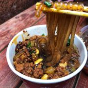 酸辣粉对重庆人民来说就是零食--上午十点来钟吃一碗垫垫肚子,下午四点左右嗦一碗充饥提神,诸如此类。 一碗好粉往往貌不惊人,需要筷子翻江倒海把味儿给掀起来。粉的火候拿捏全凭大姐经验,弹牙脆嫩不撕扯不牙碜,碗底浓油赤酱热烈欢愉,每筷挑起都挂着肉末、芽菜、花生碎、麻椒葱花,一口嗦下去麻辣酸香,走嘴不走心;两嘴嗦下去,刺激爽润头皮发痒;三口一过筷不能停,额头冒汗咸嘴麻唇,泪如雨下大汗淋漓! 爽!