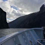 米尔佛德峡湾在毛利语的意思为“第一只野生画眉”,是位于新西兰南岛西南部峡湾国家公园内的一处冰河地形。峡湾形成于冰河时期,其最深处与米特峰相差达265米。在峡湾游船中心休息片刻,随即登上游船出海。船上有丰盛的午餐,从海鲜到冰淇淋,应有尽有。国内的八月正值新西兰冬天,夹板上风很大,比较冷,但是两侧的风光无敌。游船到达峡湾入海口便折返,令人惊奇的是,回来的路上可以看到瀑布,很中国江南的那种瀑布,竟然在南半球的新西兰的峡湾看到。