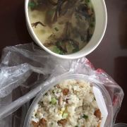 好再来嵊州小吃,就在乐苑新村小区外,旁边就是沙县小吃,但是感觉他们家的生意很好一点。 这次点了他们家的炒饭外卖,备注里要了汤料不加水。送到的速度挺快,店员也很好的送了汤料。 肉丝炒饭加了油渣,分量十足。肉丝、油渣、鸡蛋分量都挺多,每一勺都能吃到米饭和肉肉,很是满足。 当然汤料也很丰富,加上热水也是一份解腻好喝的紫菜榨菜汤。
