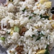 好再来嵊州小吃店,就在乐苑新村小区门口沙县旁边。店面不大,也是开了很久了。 店里主要是嵊州小吃,如嵊州豆腐年糕、豆腐小笼包、各种榨面、炒饭等,选择性还是很多的。 这次赶上一个早午饭,要了一份肉丝蛋炒饭加了油渣。分量十足,还送了紫菜饭,对于我来说,竟然没吃完。