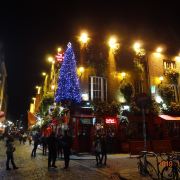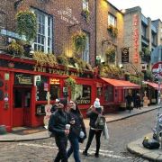 都柏林的圣殿酒吧区,位于都柏林的市中心,周围有很多传统的小巷子,酒吧和餐厅就坐落在其间。街道两边的房子都不高,很有传统特色。走在狭窄的街道里,特别有逛街的感觉。晚上这里人很多,每家酒吧或者餐厅都坐满了人,年轻人和游客居多,非常热闹。酒吧街的消费不贵,和爱尔兰其它地方差不多。酒吧街的附近还有教堂、半便士桥和三一学院也可以同时参观。