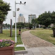 观海长廊对面的一处小公园,门口好多当地人乘凉,炮台免费进入,需佩戴口罩测温。此处是建于清末的崎碌炮台,呈环形,里面是一片草地,外面是一圈河。比较有特色的是波纹型石阶,用来将炮械循级推上台面。台面上还分布了不少通风报话塔。