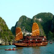 『天堂岛『』(迪独岛):越南海防省下龙湾的天堂岛,是由岛屿、海水和沙滩三部分组成。 这里也是整个下龙湾对游客开放,唯一一个可以登顶观光的岛屿。 登顶远眺,可以看到由大小喀斯特岛屿延伸的海角与天涯,天堂岛周边海水蓝的透着绿,像一块蓝宝石,又像一块翡翠; 沙滩不大,但沙子很松软,浪花很温柔地舔吻着沙滩,既是孩子的戏水天堂,也是喝着果汁享受温暖阳光的成年人乐土。 地点:越南下龙湾天堂岛