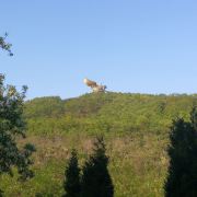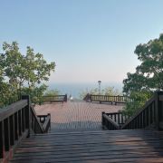 童牛岭风景区南边是泊石湾海滨,渔公码头,可以远远望见童牛飞天像。沿着银岭路到童牛飞天景区石头指路牌这里,可以走山路往童牛飞天像前进。 山路蜿蜒直上,有石路,有木阶梯,适合步行,转几个圈就来到了童牛岭童牛像前,慢走的话,可以看海景山景,记起了这首诗,欲穷千里目,更上一层楼。景色宜人,我还拍到了松鼠,惊喜。