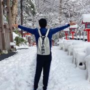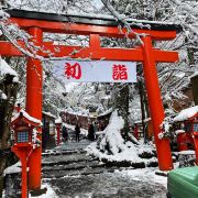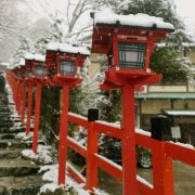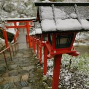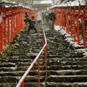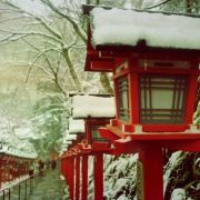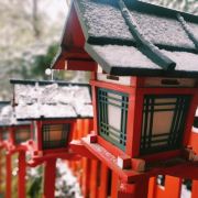 有人发夏天翠绿中的鸟居灯,也有人爱冬日白雪中的橘色鸟居灯。独爱雪,爱白色中那抹红。享受京都的飘雪,享受那抹橘红的色差冲击,也享受静怡的景色。由于旅途遥远,所以一直人不多。但是远眺近观都合适的景点