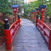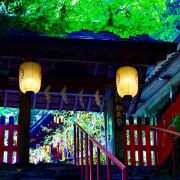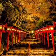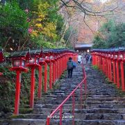 贵船神社是鞍马山西麓的古老神社,是贵船神社总本社。坐叡山电车在贵船口站下,在转乘一班【贵船口駅—贵船】的公交车就可以到达贵船神社附近。下车后还要走一段斜坡路(巴士不能再往上开了)。 沿着平坦的公路绕山而上,出现在面前的朱红色鸟居就是贵船神社。长长的阶梯,阶梯两侧有很多红色的献灯,这也是贵船神社上镜率最高的地方——献灯参道。在阶梯底层的一旁,已经很多摄影师在占据有利的拍摄位置,等待晚上的亮灯。青石板铺成的台阶从鸟居延伸到神社的本宫,参道两侧立着朱红色的献灯,从下往上看密密麻麻铺满了一路,甚是壮观。