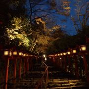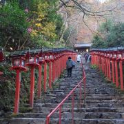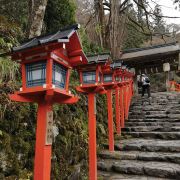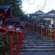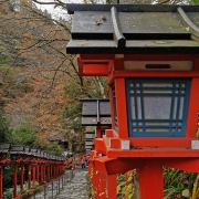 沿着平坦的公路绕山而上,出现在面前的朱红色鸟居就是贵船神社。长长的阶梯,阶梯两侧有很多红色的献灯,这也是贵船神社上镜率最高的地方——献灯参道。在阶梯底层的一旁,已经很多摄影师在占据有利的拍摄位置,等待晚上的亮灯。 贵船神社是鞍马山西麓的古老神社,是贵船神社总本社。这里也是京都的水源地,贵船神社奉祀的是京都人最崇敬的水神,已有1600多年的历史,比京都本身的历史还要悠久。 青石板铺成的台阶从鸟居延伸到神社的本宫,参道两侧立着朱红色的献灯,从下往上看密密麻麻铺满了一路,甚是壮观。