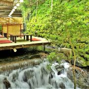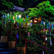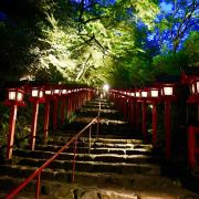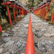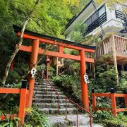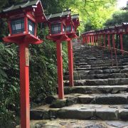 沿着稍陡的山径一路向上,身旁伴随着轰轰的流水声,一看是带着丰沛水量的溪流从旁流过,喷发出来的水分子,让暑气全消,欣赏著小溪上架著的川床,来上一份流水素面,真是一大享受,最后再至贵船神社参拜,非常推荐大家来逛逛。