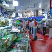 第一市场就是一个菜市场,百货市场。去第一市场停车很难,所以更推荐打车、坐公交车过来。市场里面的海鲜摊位比较多,要多对比对比,市场内有公平秤,也有海鲜的价格公示。 挑海鲜的时候,不必麻烦商家帮你挑,自己学点挑选技巧吧。挑螃蟹的时候捏捏蟹腹,捏起来结实、饱满,就比较肥啦。或者可以掂量掂量,比较沉,说明膏脂比较饱满。 挑龙虾找虾尾很胖很饱满的,挑皮皮虾、基围虾找那些鲜活的,在水里游得比较欢快的,别选那些沉在水底的。沉在水底的,要么是si翘了的,要么是快shi的。 不打算吃海鲜,周边还有不少海南特色的米粉,陵水酸粉、港门粉,这两种我比较喜欢。陵水酸粉酸辣鲜,港门粉很鲜。还有第一市场北边河西路情人桥旁边的萌哒哒椰子鸡,也是鲜甜那一挂的海南特色菜。 萌哒哒是三亚很有知名度的椰子鸡连锁,口味正宗,鸡汤香香的,鸡肉嫩嫩的,是招牌餐。另外第一市场附近的建设街也有很多美食餐厅,川菜馆,西北面馆,这些也有。来三亚旅游,不知道吃什么的时候,来第一市场就对了。