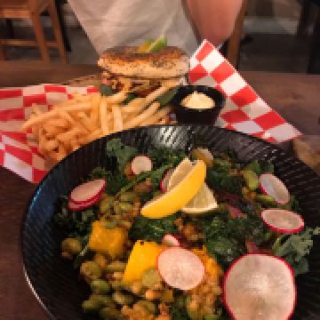 这家的汉堡包做的很有意思,用的面包像甜甜圈一样,中间是镂空的,里面的芝士给的超级多,一个吃下去一个下午都不会觉得饿,装水的瓶子很好看。
