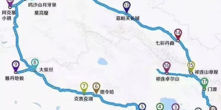 行程:塔尔寺 - 拉脊山 - 日月山 - 青海湖二郎剑景区 - 茶卡盐湖 - 环湖西路 - 仓央嘉措文化广场 - 大冬树山垭口 - 卓尔山 - 阿柔大寺 - 张掖七彩丹霞旅游景区 - 嘉峪关关城 - 长城第一墩 - 莫高窟 - 鸣沙山月牙泉
