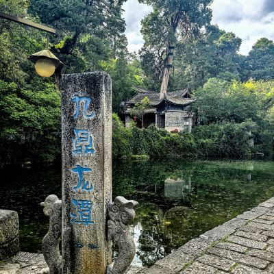 九鼎龙潭又称龙泉,位于束河古镇的西北角,是古镇内比较主要的景点之一。龙潭是古镇上溪流的水源地,依山傍河,有一上一下两个半圆形的石潭,潭水清澈见底,周围绿树环绕。在两座潭水的中间有一个凉亭,这里也是欣赏潭水极好的地方。传说古时曾经有人想在潭水中捕鱼,结果当时电闪雷鸣,从此当地人再也不敢在龙潭中捕鱼,所以潭水中的鱼儿也很多。观赏这些鱼儿自由的摇曳在水中,也给人舒心惬意之感。