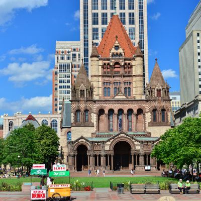 三一教堂位于卡普利广场的中央,是美国建筑中的杰作。现在看到的是1877年三一教堂为教会建筑设计提出一个大胆而新鲜的主意而重新设计建造的。教堂红褐色砂岩墙体上刻有精细的浮雕,巨石拱门下配合青铜大门,高大的红顶塔楼,使这座建筑格外的美观,一度被评为全美十大建筑之一。