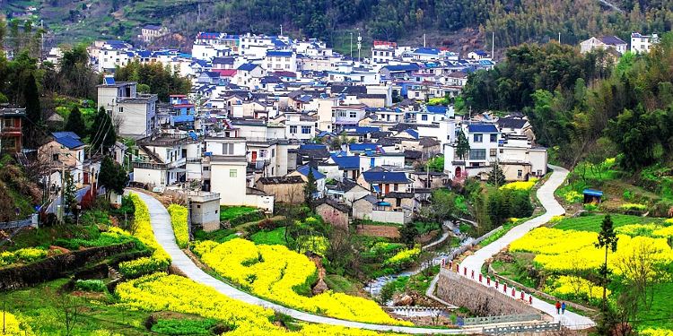 梅干岭梯田,油菜花与徽派古村落交相辉映,构成一道靓丽的风景线