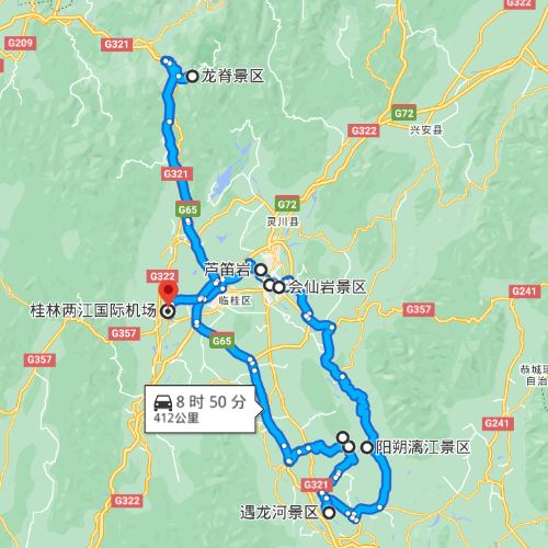 行程:芦笛岩 - 桂林西山景区 - 日月双塔文化公园 - 桂林市榕杉湖景区 - 会仙湿地 - 漓江风景名胜区 - 遇龙河景区 - 相公山景区 - 九马画山 - 龙脊梯田 - 龙脊梯田风景名胜区-古壮寨 - 黄洛红瑶寨