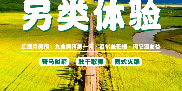 行程:查真梁子 - 红原月亮湾 - 黄河九曲第一湾 - 若尔盖花湖生态旅游区 - 若尔盖河它温泉谷 - 川主寺镇 - 松潘古城