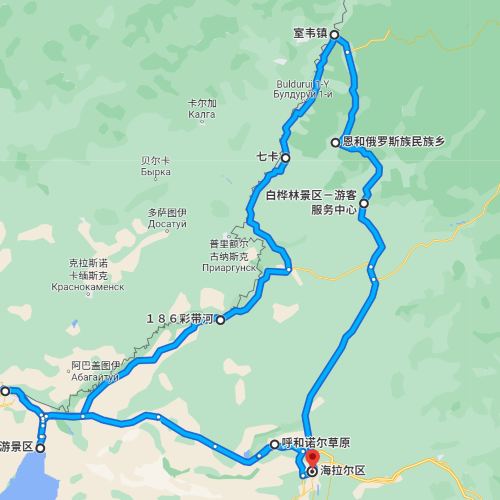 行程:呼伦贝尔大草原 - 莫尔格勒河景区 - 额尔古纳湿地 - 白桦林景区 - 恩和俄罗斯族民族乡 - 中国室韦口岸 - 室韦 - 七卡 - 黑山头镇 - 186彩带河 - 满洲里国门景区 - 俄罗斯套娃广场 - 呼伦湖 - 呼和诺尔草原旅游区