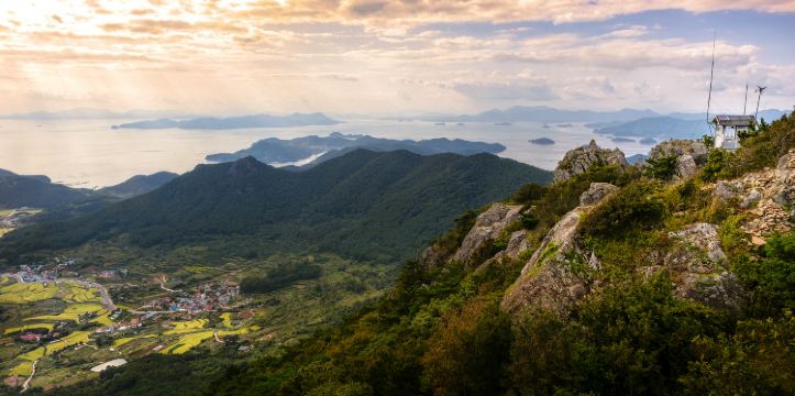 弥勒山高度为461米,虽然不算很高,山里有葱翠的树林和清澈的溪谷,还有怪石和古刹。登上山顶可以看到统营