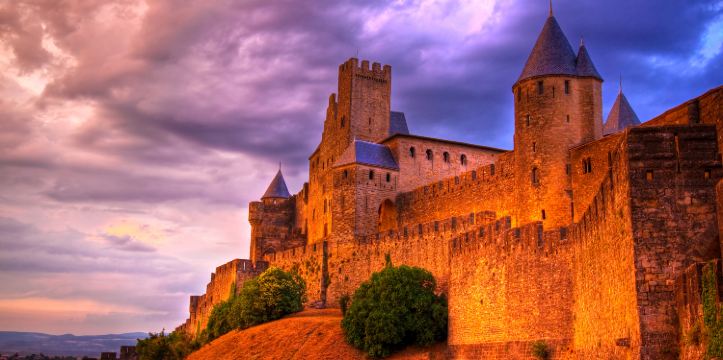 “法国有个叫做卡尔卡松的城市, 壁垒, 塔楼, 棱堡, 城垛, 碉楼, 还有成片的葡