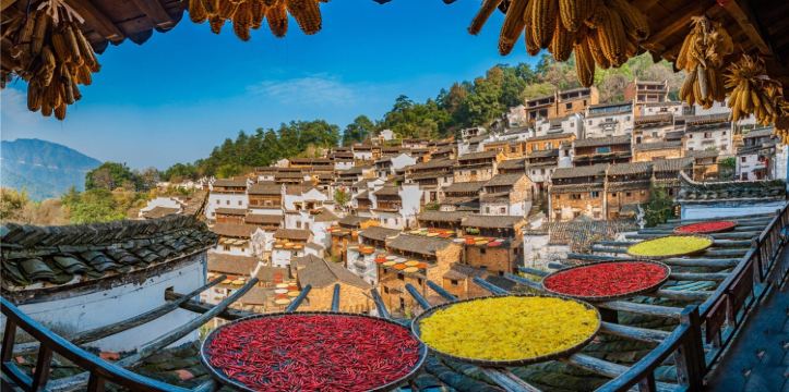 江西篁岭因“晒秋”闻名遐迩,村落犹如玉带一样古建筑串接起来,前街后坊,商铺林立,更有万亩梯田景观簇拥