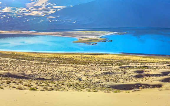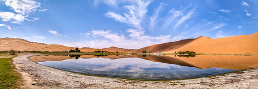 "罕见沙漠淡水湖,绿茵依依"