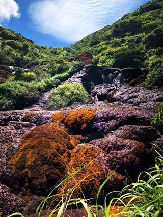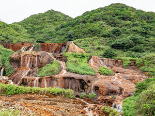 黄金瀑布位于金瓜石往水湳洞的公路边,一般瀑布是水流行进间因地势落差而造成,黄金瀑布却是地下伏流涌出地面,前后都见不到溪流。流水的大小、走向还会因为雨量的多寡而呈现不同的面貌,大雨过后,水量丰沛非常壮观。雨水渗入矿区后,与黄铁矿和硫呻铜矿接触,经过氧化还原与铁菌催化,使瀑布水呈现金黄偏橘色的酸矿水,后人美其名为黄金瀑布。