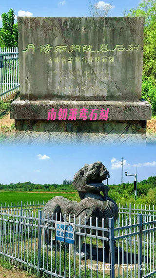 南朝陵墓石刻都是南朝皇帝和王侯陵墓前的神道石刻,镇江丹阳境内有12处,其中石兽20只。大者重约30余吨,小的也有七八吨。这些石兽与底座系的一个巨石,造型优美,线条流畅,细腻而奔放,洋溢着浓郁的江南艺术情调。