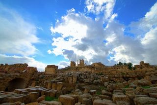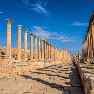 现在广场上的石柱,是现代人立起来的,为每年一度的杰拉什音乐节燃放烟火使用。广场长90米,宽80米,由同心圆方式排列的石板铺成,四周环绕着优雅的爱奥尼亚石柱,犹如琴弦一样整齐矗立,为巨大而充满刚性力量的广场镶上一圈柔美的花边,设计颇具匠心。这些圆柱是公元一世纪所建,部分是7世纪补建的。这是世界上现存古罗马古迹中保存较完好的圆柱广场,是杰拉什非常壮丽的场景。从规模和布局上,圣彼得广场都无法与杰拉什的圆柱广场相比。