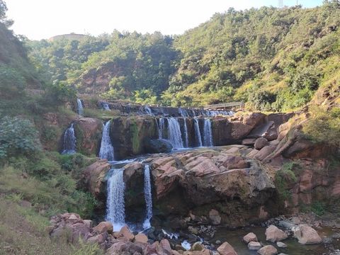 "三级瀑布浑然一体,落差大"