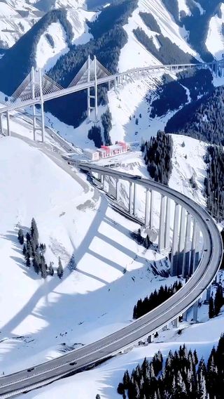 果子沟大桥是国道045线赛里木湖至果子沟高速公路的一座桥,桥梁全长约700米,桥面距谷底净高约200米。它是一座斜拉高桥,集新技术、新结构、新工艺、新设备“四新”于一身,是新疆公路建设史上一次重大突破。