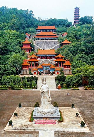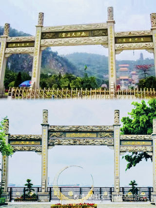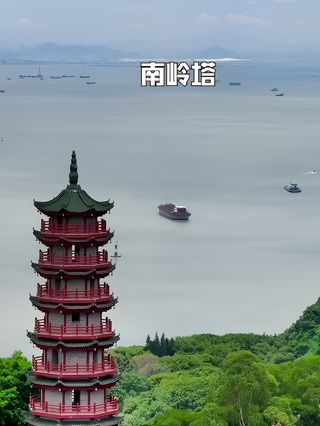 南岭塔处于南沙天后宫的后方,是为纪念海上女神林默而建,塔高45米、共8层。之所以是8层(双数),与其他塔为单数不同,是因为民间传说中有一条不成文的规定:男神仙的代码是单数,女神仙的代码是双数。因此天后宫里,无论是台阶、瓦楞还是对联(上联或下联)字数,都是呈双数的。