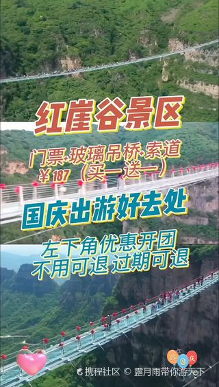 红崖谷旅游度假景区位于河北省平山县温塘镇板山村,打造的沿途景观大道及白鹿古镇、华严寺、红崖湖、状元路、健身步道、莲花溪等项目现已对外开放。心动之旅玻璃悬空索桥、林溪花海、汽车露营地等将于7月陆续向游客开放。