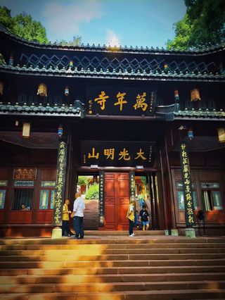 万年寺是步行登山的起点之一,寺中的无梁殿,全部为砖结构建筑,是万历皇帝为其母祝寿而建。寺中的“行愿楼”内供奉着三宝:佛牙、贝叶经和万历金印,是你不可错过的珍宝。如今的万年寺,大部分建筑是1953年重建的。始建于明万历28年的无梁殿,殿内的内壁下部有二十四个佛龛,每个佛龛内放有铁铸的佛像。无梁砖殿内还供奉有一尊普贤铜像,造型为普贤菩萨坐在六牙白象背上的金色莲花宝座之上。殿后的“行愿楼”内供奉着:佛牙、贝叶经和万历金印。佛牙长约40厘米,是明代嘉靖年间斯里兰卡的僧人所赠。事实上据专家考证,这枚牙齿是剑齿象的牙齿化石。贝叶经为明代暹罗(今泰国)国王所赠,上书梵文《尊益阿含经》全部经文,具有“不柱虫,不霉变,不千碎”等特点,为佛门至宝。三宝之一的万历金印尤为珍贵,这枚方印13厘米见方,重4公斤,是明代万历皇帝御赐的印章,刻有“大明万历,敕赐峨山,御题砖殿,普贤愿王之宝”的文字,因是帝王赏赐,虽为铜质僧人亦尊称为金印。寺中环境清幽,留存有大量历史碑刻,其中更有宋代书法家米芾手书的“第一山碑”。