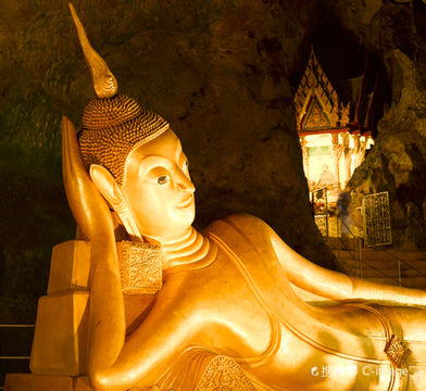 "观赏洞穴里金光灿灿的卧佛"