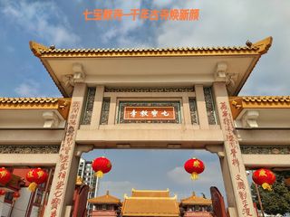 今天的七宝寺乃移址重建于2002年,汉唐建筑风格,朴素大方,庄严肃穆,总体上分寺、园两部分,占地43亩。有教寺桥、正山门、钟鼓楼、天王殿、大雄宝殿、经堂、法堂、藏经楼、六十星宿长廊、宝塔。寺院内东有牡丹花园和聚宝莲池。牡丹花园有牡丹亭。聚宝莲池汇聚了镇寺六宝铸铜雕塑,飞来佛铸铜佛像现在飞来佛殿里供奉。聚宝莲池周围设有画廊和诗廊,美其名曰“古风长廊”。