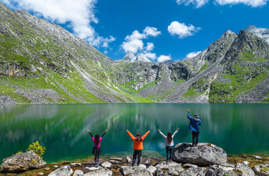 "四周群山环绕的高山湖泊"