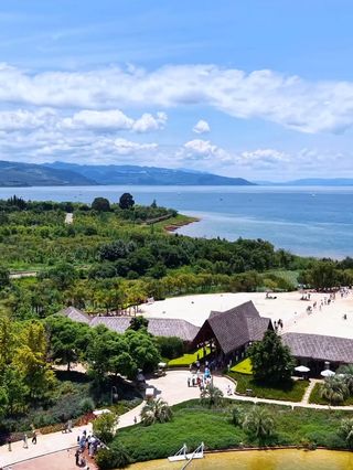 月亮湾湿地公园与抚仙湖悦椿度假酒店相邻,适宜散步观景。较南侧湖畔有一片开阔的椰林树影沙滩,仿佛置身于阳光海岸。公园有一条以古化石图片、文字介绍装点的地下通道与悦椿酒店相连。