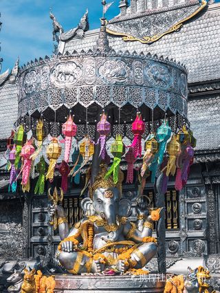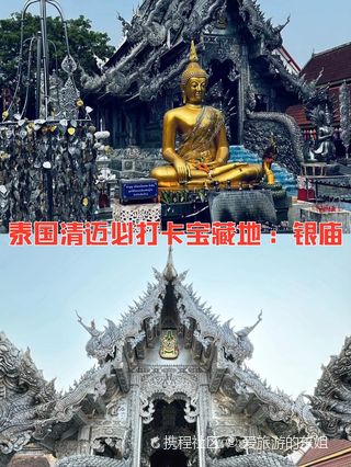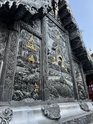 锡苏邦寺是清迈唯一一座纯银打造的寺庙,在清迈古城南面,整座戒堂是用纯银、复合银和铝的混合体打造,银光闪闪,特别震撼。寺庙里的指示牌、装饰品也都是银片做的。浮雕精巧细致、观赏性非常强,几乎所有的创新、文化元素都是用浮雕表现的。这里不但是个庙,还是个银雕工坊,在庙的一角有着一群银匠乒乒乓乓敲打着银块,银块上被敲下精致漂亮的图案,让很多游客颇感兴趣。