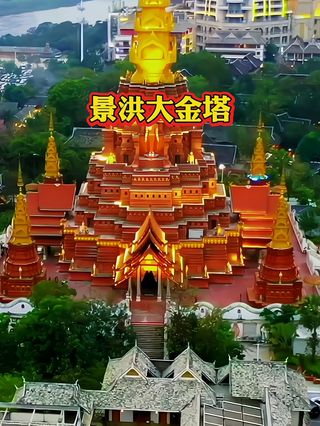 景洪市大金塔寺,也称缅甸大金塔,位于景洪市沧江新区宣慰大道江北段环岛旁。景洪市大金塔寺身高六十六点六米,寓意一江连六国,其中四小塔为实心塔,大塔为贝叶经博物馆,共两层使用空间,有东西南北四个入口,正中塔柱周围供奉星期佛,供游人祈福。
