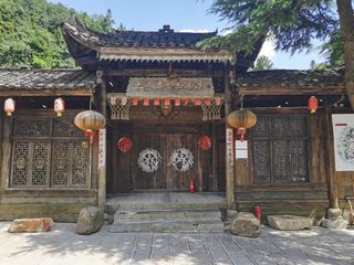 袁家寨子位于张家界武陵源重点景区,是袁家界风景区范围内仅有的一个私人建筑。当地地主的寨子被完整保存下来,成为旅游一大景点。还保留土家族的建筑特色,屋檐角往外斜飞,屋檐下挂着一串串玉米跟辣椒,土家人民热情好客,喜欢用自家酿制的美酒招待贵客,喝酒前还必须唱歌祝酒。阿妹祝酒完毕,游客每人尝了一杯,酒精度不高,好像只有几度吧,不难喝,没什么感觉……土家的三大特色之前就有耳闻“赶尸、哭嫁、下蛊”,至今都是未解之谜。这是阿妹下蛊用的蛊虫。西兰卡普——土家族的一大特色,是出嫁的女子用各色彩线一手一手编织而成的,工艺精美,费时很长。袁家寨子秉承着土家族建筑的特色,寨门檐角向上翘起,中间横着“袁家寨子”的牌匾,两侧挂着大红灯笼,寨门上挂满了金黄色的老玉米,我们一到就有寨子的人就吹起唢呐、打起鼓来,非常热闹。进门之后一只猛虎横卧于前,一个孩子和一只巨猿坐在旁边,这是土家族的图腾,他们自古流传信奉“以虎为父,以猿为母”。寨子里面展示的是一些土家族的繁衍历史、生活习性、使用物品等等。去过袁家界的人都知道,山上的雨天、雾天多,有了寨子,游客就是看不见山也不遗憾,因为山上还有这么个好去处。
