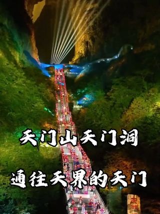 天门洞,位于天门山国家森林公园山体中部,是台地边缘的一个地下溶洞,因向斜构造之力挤压、坍塌、溶蚀,南北两端岩层崩落。天门山国家森林公园古称嵩梁山,三国吴永安六年(公元263年),山体忽然峭壁洞开,玄朗如门,形成迄今罕见的世界奇观——天门洞。吴帝孙休认为这是吉祥征兆,于是易嵩梁山为天门山国家森林公园。天门洞高131.5米,宽57米,深60米,南北对开千寻素壁之上,扶摇而通天,气象变化万千,似明镜镶嵌于蔚蔚天幕之上,终年白云紫雾,氤氲蒸腾,气势磅礴,巍峨高绝,是世界罕见的高海拔天然穿山溶洞。