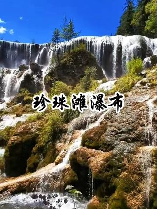 珍珠滩瀑布,是九寨沟大的钙华瀑布,来自山中融化的雪水,从21米的高处冲进谷底,吼声如雷,卷起千堆浪花,这道激流水色泛白,是九寨沟所有激流中水势猛,水声大的一段。激流左侧栈道,是观赏瀑布的佳点。珍珠滩瀑布位于镜海和金铃海之间,瀑布底部空气清新,林木茂盛,踩着栈道,在激流的陪伴下继续东行,就到了珍珠滩东侧。瀑布的水因为含硫量高,不能引用。