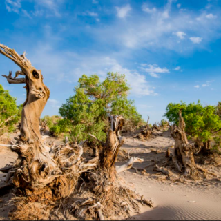 在辽阔的草原上,奇妙地出现了一座长约五公里,以石英长石堆积而成的沙山,山呈东北-西南走向,西缓东陡。脚下有条小河蜿蜓流过。当人们从沙山顶往下滑时能听到从山的内部发出的声音,犹如万马奔腾,海潮汹涌,故名鸣沙山。