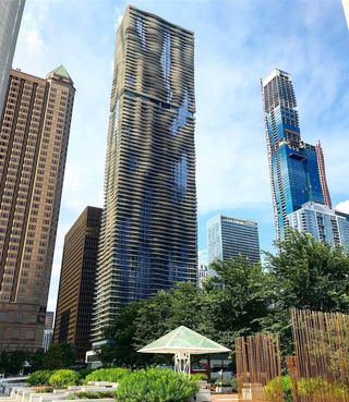 Aqua大楼是迄今为止由女性建筑师领导的事务所设计的较高的建筑物。这幢外表呈波浪形的建筑物,带来了摩天楼设计的新方式。Aqua有“水”的意思,整个建筑看起来像一个巨型雕塑。同时大厦强有力的形体犹如石灰岩层,体现了那种塑造大湖区域的地质力量,建筑立面是玻璃幕和每层略有不同的波浪形阳台的组合,产生出水面涟漪的效果。阳台从玻璃幕墙伸出,可达3.7米远。