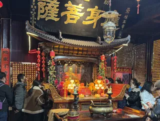 百岁宫位于池州市东南50公里处的九华山上,始建于明代,屡有毁建。庙内供奉着明代无瑕和尚的肉身,因其活到126岁才圆寂所以寺庙得名“百岁宫”,无瑕圆寂后尸身一直不腐,是九华山现存古老的肉身,所以百岁宫是到九华山必游的寺庙之一。百岁宫的主体建筑白墙黑瓦,沿着山崖呈南北走向狭长型排布,好似城墙,。跨过南边的山门,是放有香炉的院子,北边即大雄宝殿,殿门上的牌匾有黎元洪写的“钦赐百岁宫护国万年寺”几字,由大雄宝殿的侧门可进入肉身殿。