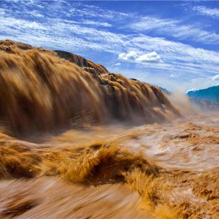 陕西黄河壶口瀑布位于秦晋大峡谷黄河河床中,以东是山西临汾地区,以西属陕西延安宜川县,具体在延安市宜川县城以东约35公里处,由于黄河水携带很多泥沙,这里成为了世界上少见的金黄色瀑布。